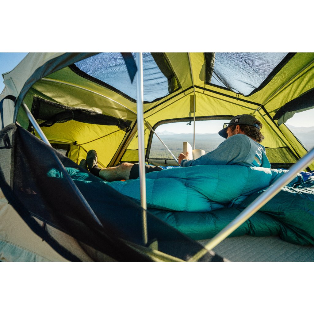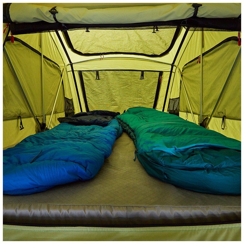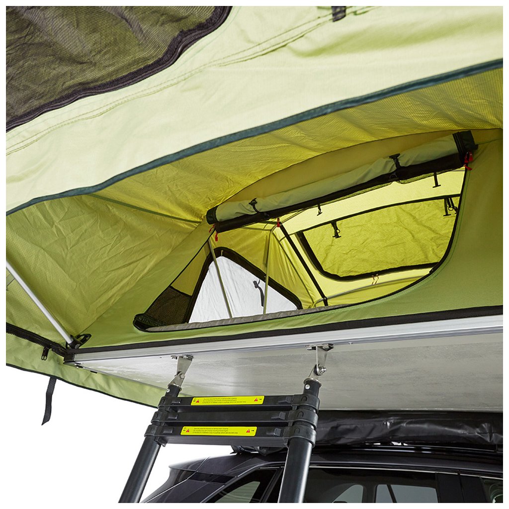 Rychle rozložitelný softshellový autostan Yakima SkyRise HD MD Green pro 2 osoby s prodlouženou přední částí pro krytý vstup po žebříku.