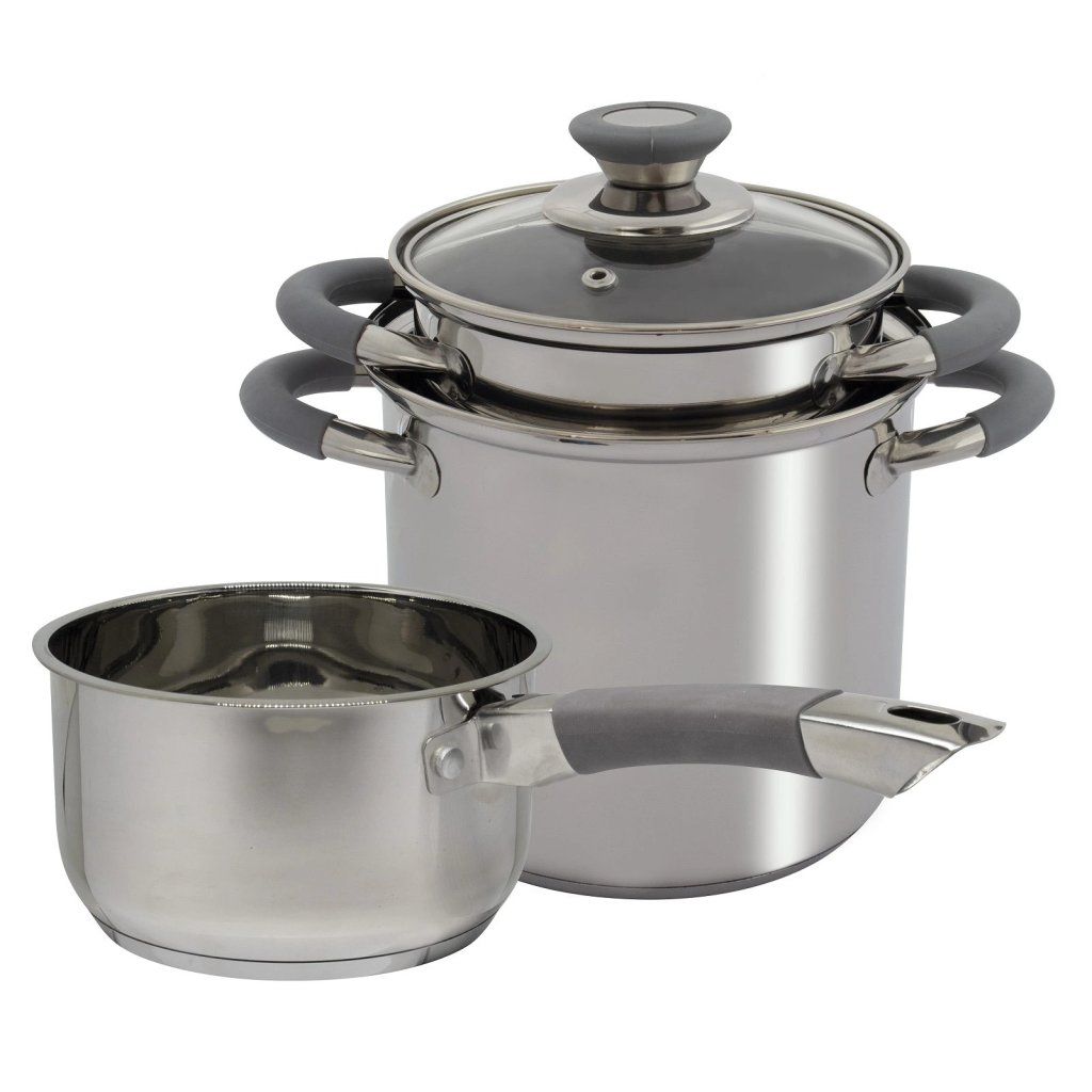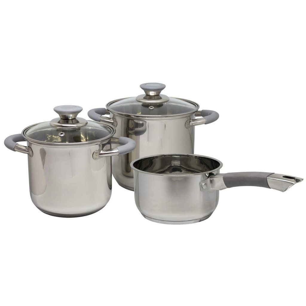 EUROTRAIL Sada hrnců Dunbar je praktický a odolný set z nerezové oceli, který zahrnuje 2 hrnce se skleněnými poklicemi a rendlík, ideální pro přípravu omáček, polévek i běžného vaření. Díky žáruvzdorným silikonovým rukojetím je manipulace bezpečná a pohodlná, zatímco kapslové dno zajišťuje rovnoměrné rozložení tepla a úsporné vaření. Set je kompatibilní se všemi typy sporáků – plynovými, elektrickými, keramickými i indukčními – a po odejmutí poklic je vhodný do myčky na nádobí, což usnadňuje údržbu. Sada Eurotrail Dunbar kombinuje luxusní design, praktičnost a dlouhou životnost, což z ní činí ideální nádobí pro moderní kuchyni.