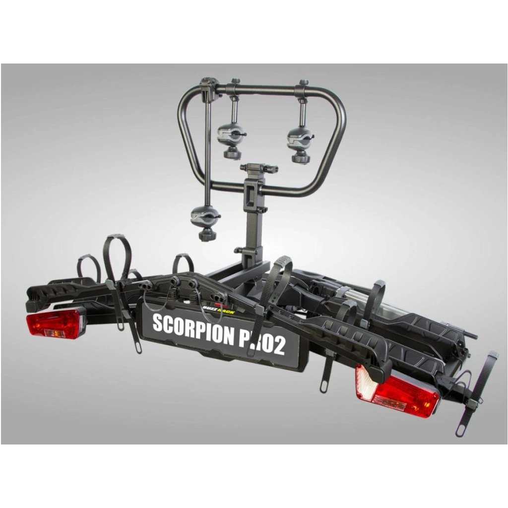 Nosič kol BUZZRACK SCORPION PRO k přepravě dvou e-biků. Rychloupínací systém na tažné, nakládací rampa v ceně, dvojité zamykání jízdních kol. Rozšířitelný o další pozici.