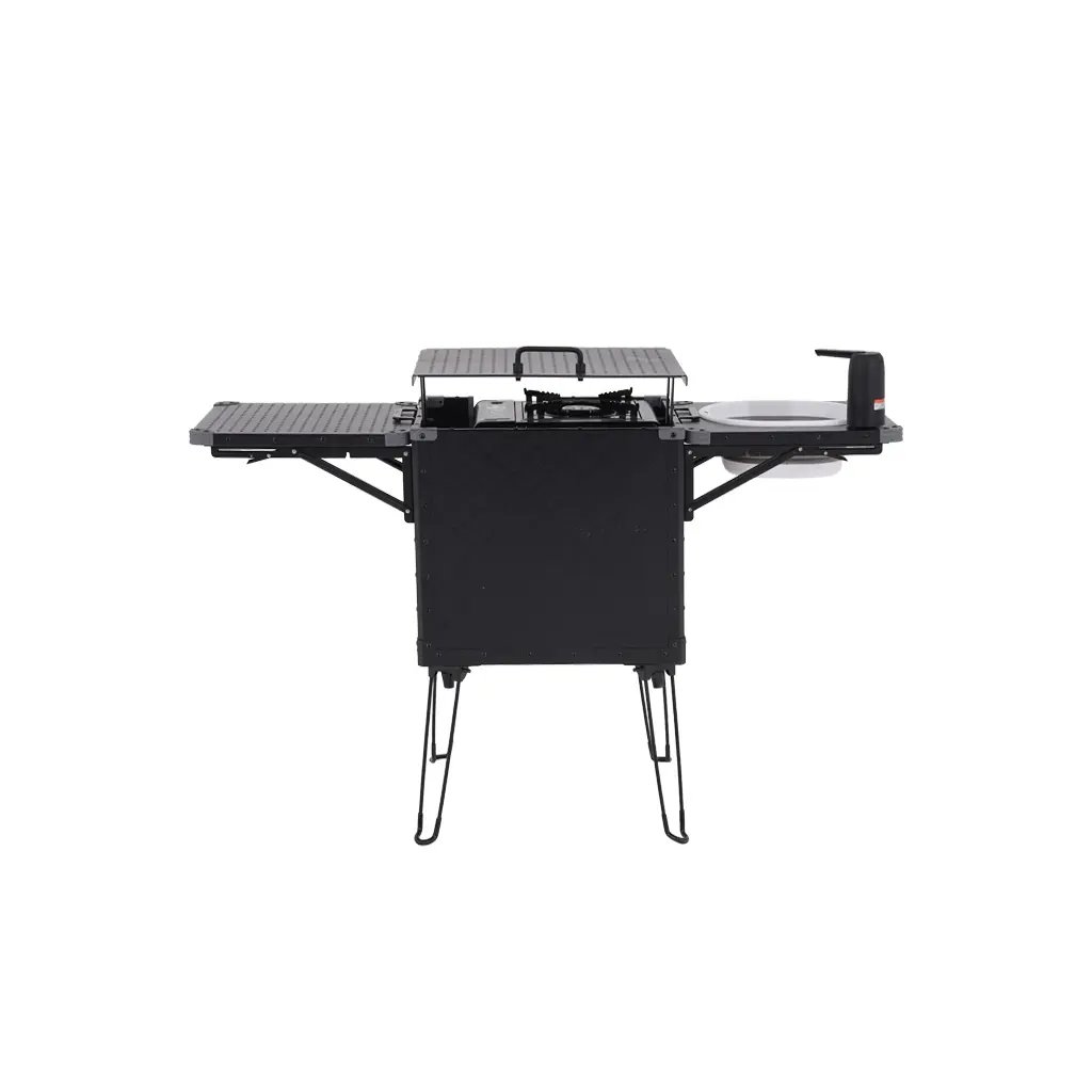 Přenosná skládací kuchyňka WILD LAND se sporákem, dřezem, baterií s čerpadlem a praktickými úložnými prostory – ideální pro kempování a cestování.