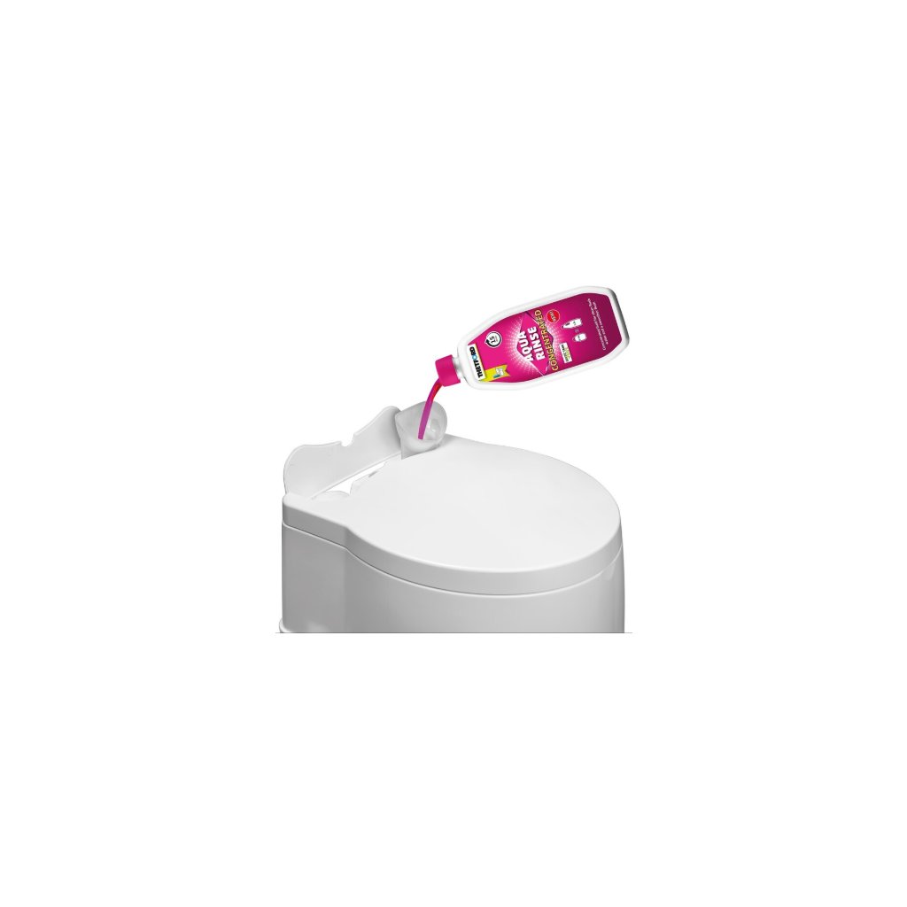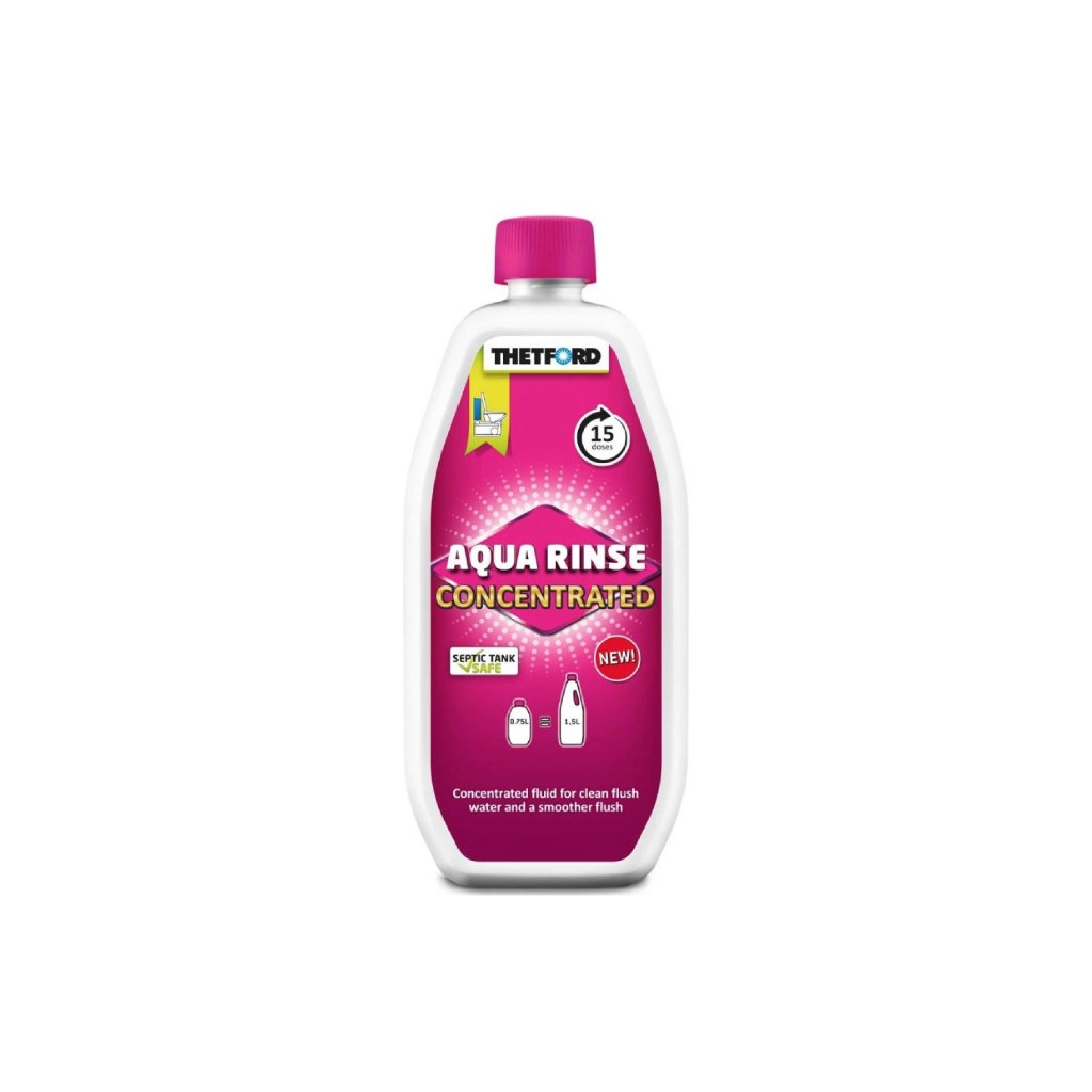 Thetford Aqua Rinse koncentrát je vůně a desinfekce pro splachovací nádrže chemických toalet v koncentrované verzi. Tento tekutý prostředek se dávkuje do splachovací nádoby. Udržuje splachovací nádobu čistou, bez usazenin, s příjemnou levandulovou vůní. Koncentrované balení obsahuje stejný počet dávek jako 1,5l láhev.